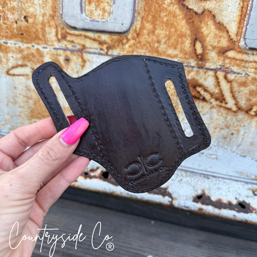This Aztec Tooled Leather Knife Sheath brings a southwest twist to durability with its hand-painted tooled leather front that tells a story with every detail. The smooth leather back ensures comfort and sturdiness, making it as reliable as it is eye-catching. Perfect for those who want their gear to stand out while keeping their knives safe on every adventure.