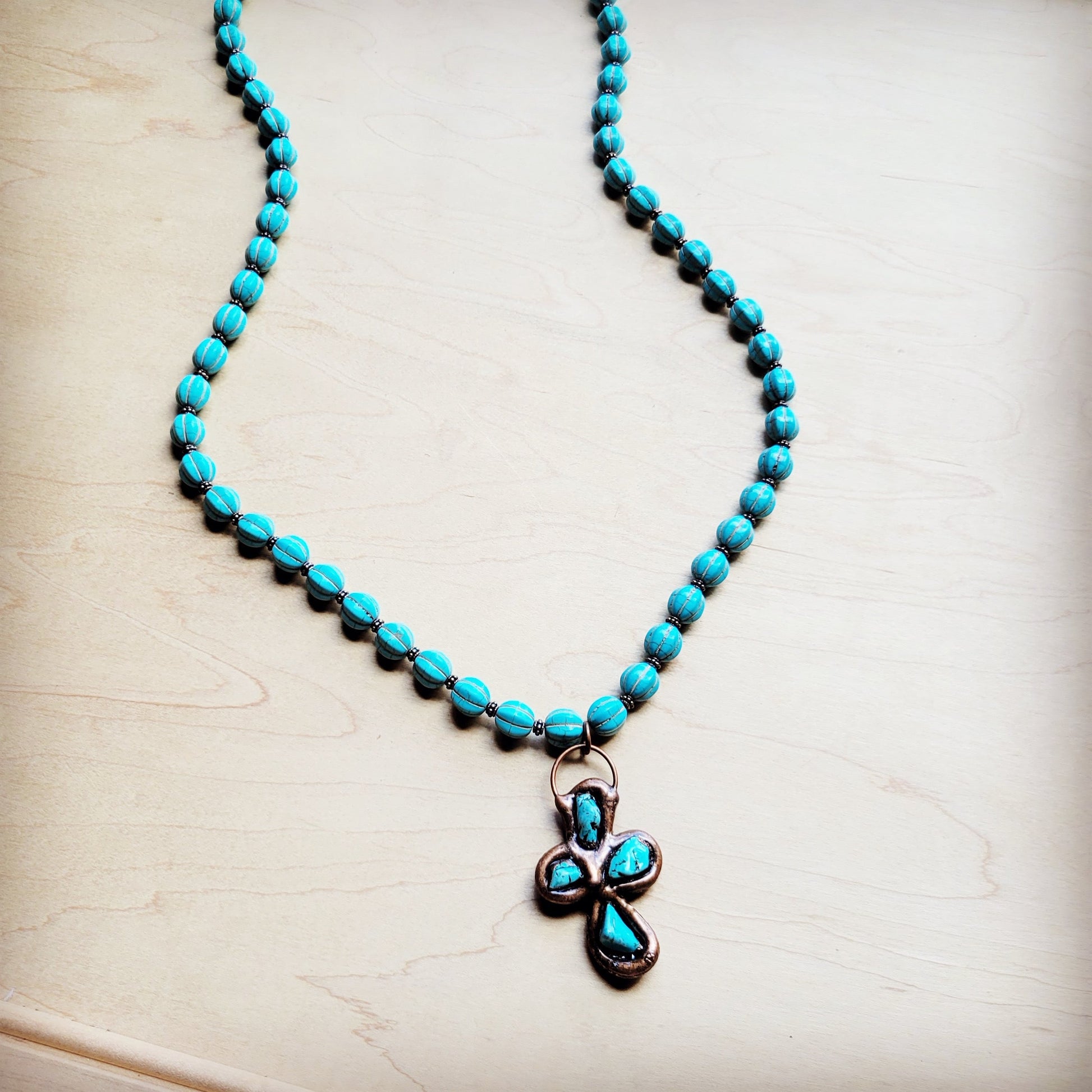 Expertly handcrafted, this boho necklace features a stunning combination of blue turquoise melon beads and a stunning soldered copper cross. The perfect statement piece, this necklace exudes a unique charm. Elevate any outfit with this one-of-a-kind necklace.
