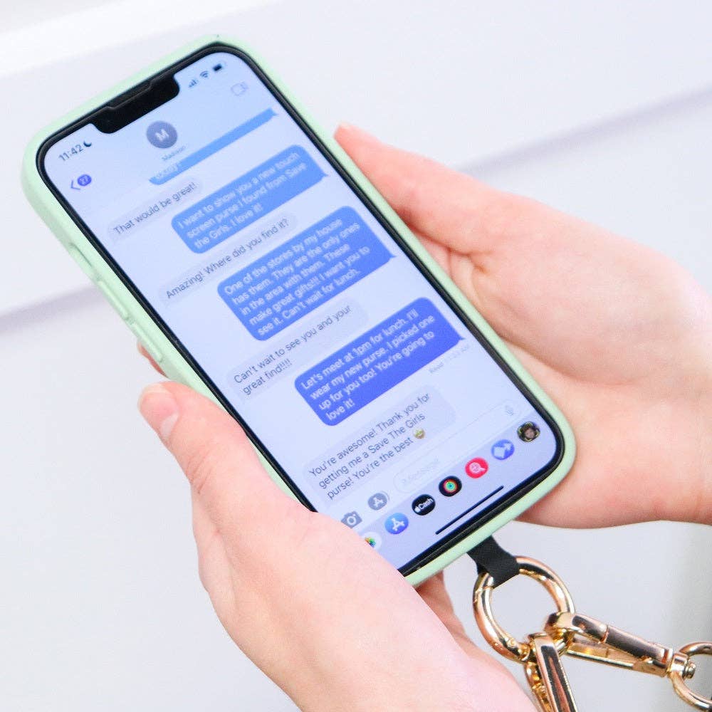 Simply place our phone card in your phone case and slip the phone card tab through the phone charging opening. You can then clip our beautiful, adjustable shoulder strap to the tab and go! It is so convenient and you can still access charging port as normal. Wear your phone hanging at the end of the shoulder strap or remove the separate wristlet strap section and carry your phone on your wrist! Carry cash, credit cards, change or other small essential items safely and securely in the zippered pouch. Wear it your way, just Clip & Go!!