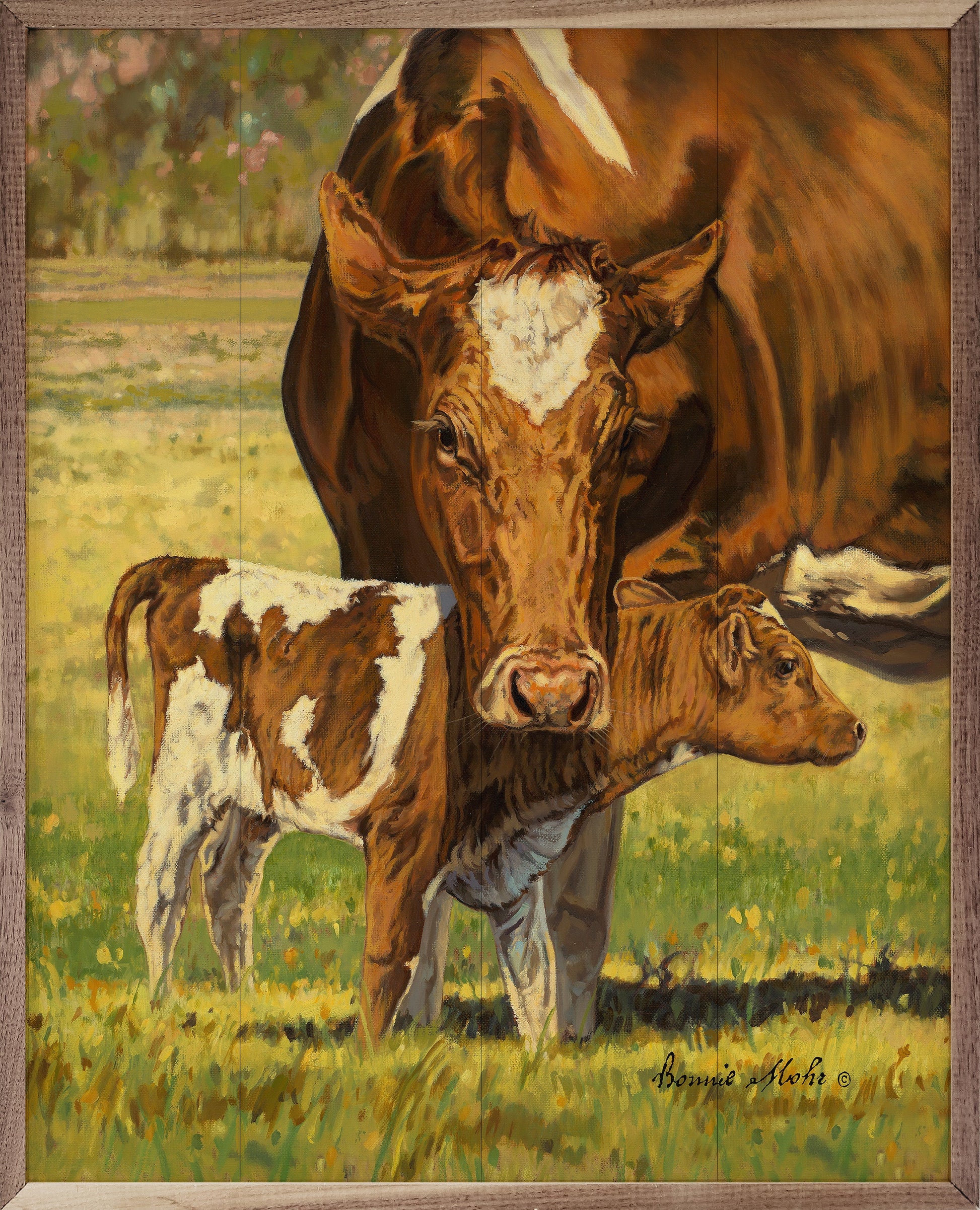 Artwork by artist Bonnie Mohr makes this beautiful unique piece a simple way to bring beauty and charm to any wall or shelf within the home. It is made from high quality American hardwood planks with a hand painted face, and printed with UV cured ink, and is framed in a natural walnut frame. Each piece is unique with its own personality, marks, wood grain, and look. Easy to clean with a dry cloth.
