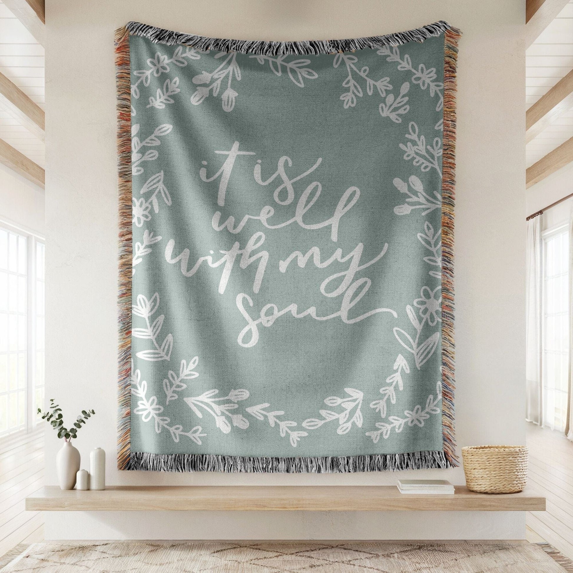 Wrap yourself in comfort and inspiration with our It Is Well Woven Blanket. Featuring a calming sage green background with bold white hymn-inspired lettering and florals, this cozy throw is both meaningful and beautiful. Designed around the timeless words of the hymn “It Is Well with My Soul,” this Christian woven blanket brings a message of peace and hope into your home.