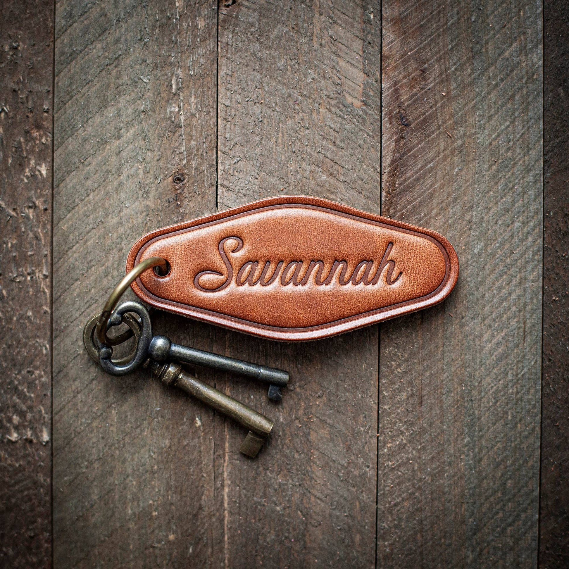 Unique and personalized gift! Our leather keychains are cut and pressed by hand from some of the thickest and finest harness leather available, and patina beautifully as they age. We have many more styles planned for the near future, so check back soon and often! Need custom branding or something special for large order gift baskets? Reach out today!