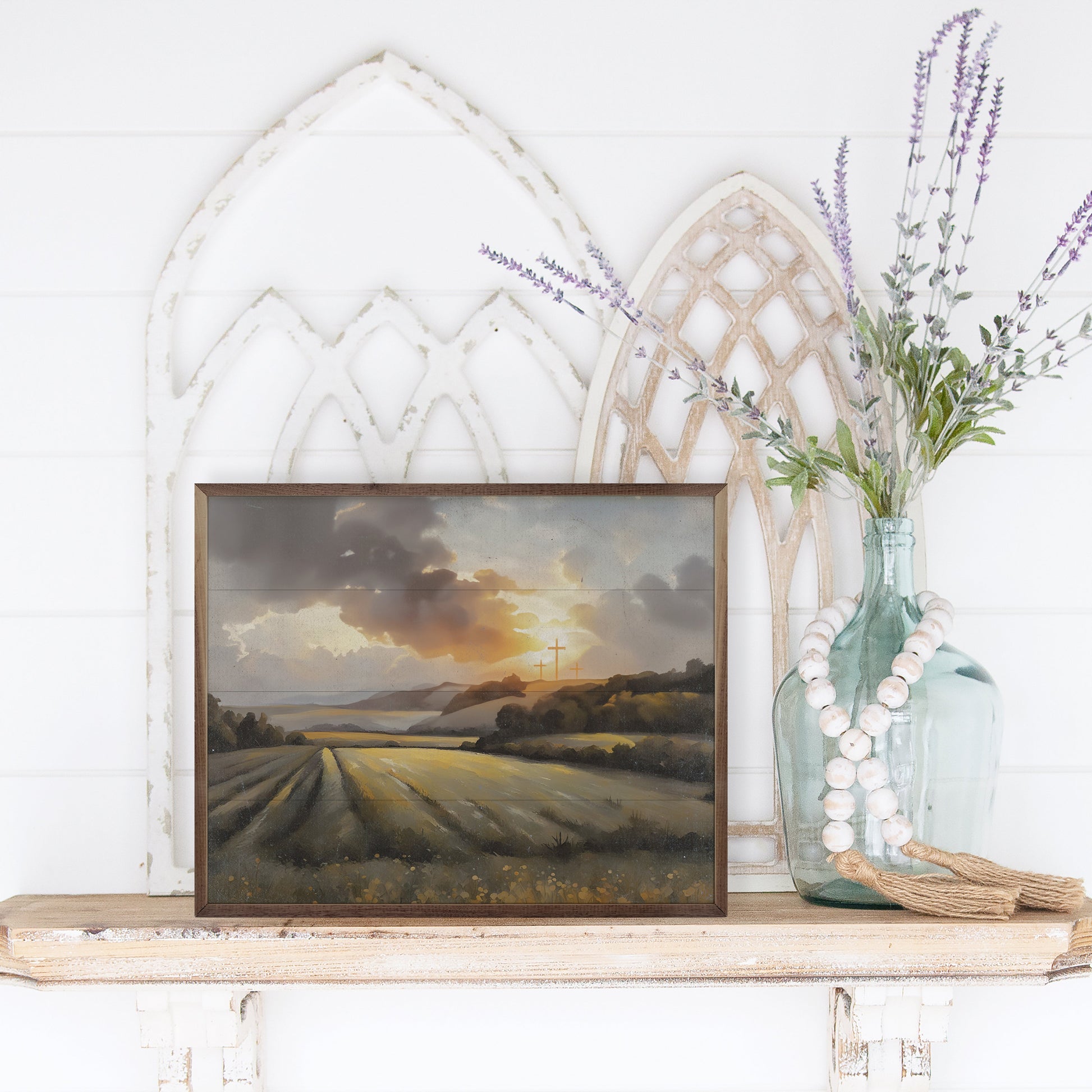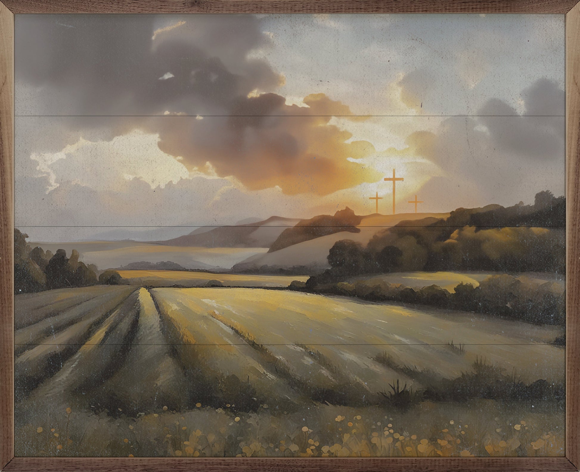This unique piece is a simple way to bring beauty and charm to any wall or shelf within the home. It is made from high quality American hardwood planks with a hand painted face, and printed with UV cured ink, and is framed in a natural walnut frame. Each piece is unique with its own personality, marks, wood grain, and look. Easy to clean with a dry cloth.