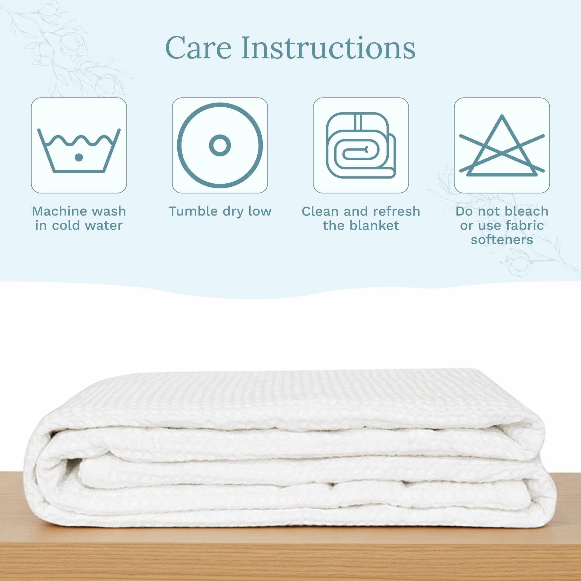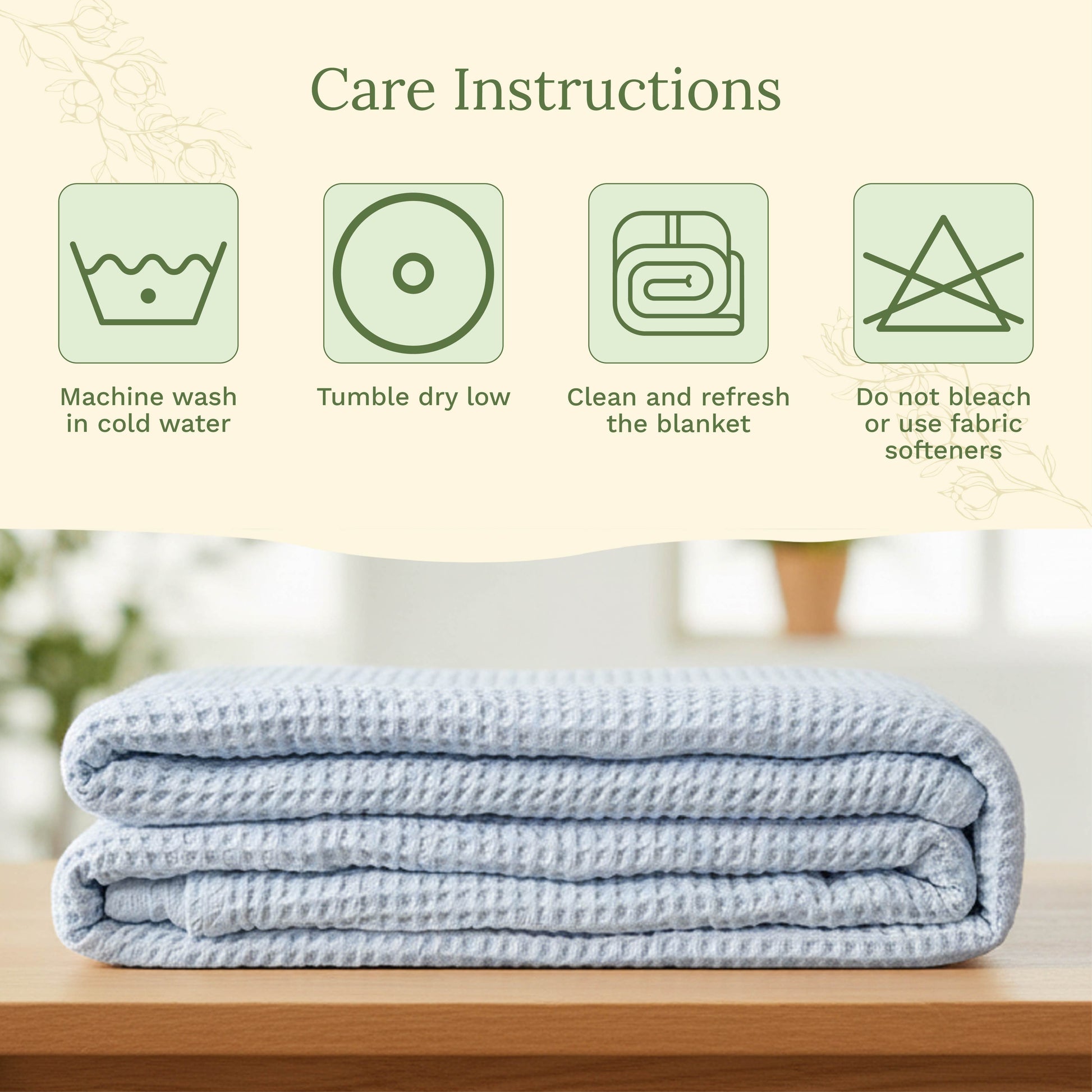 100% Pure Cotton: Our Waffle weave blanket is made using only 100% cotton that’s lightweight, breathable, and gentle on the skin. This blanket is durable and maintains its soft texture to provide the perfect fit for sensitive and delicate skin.