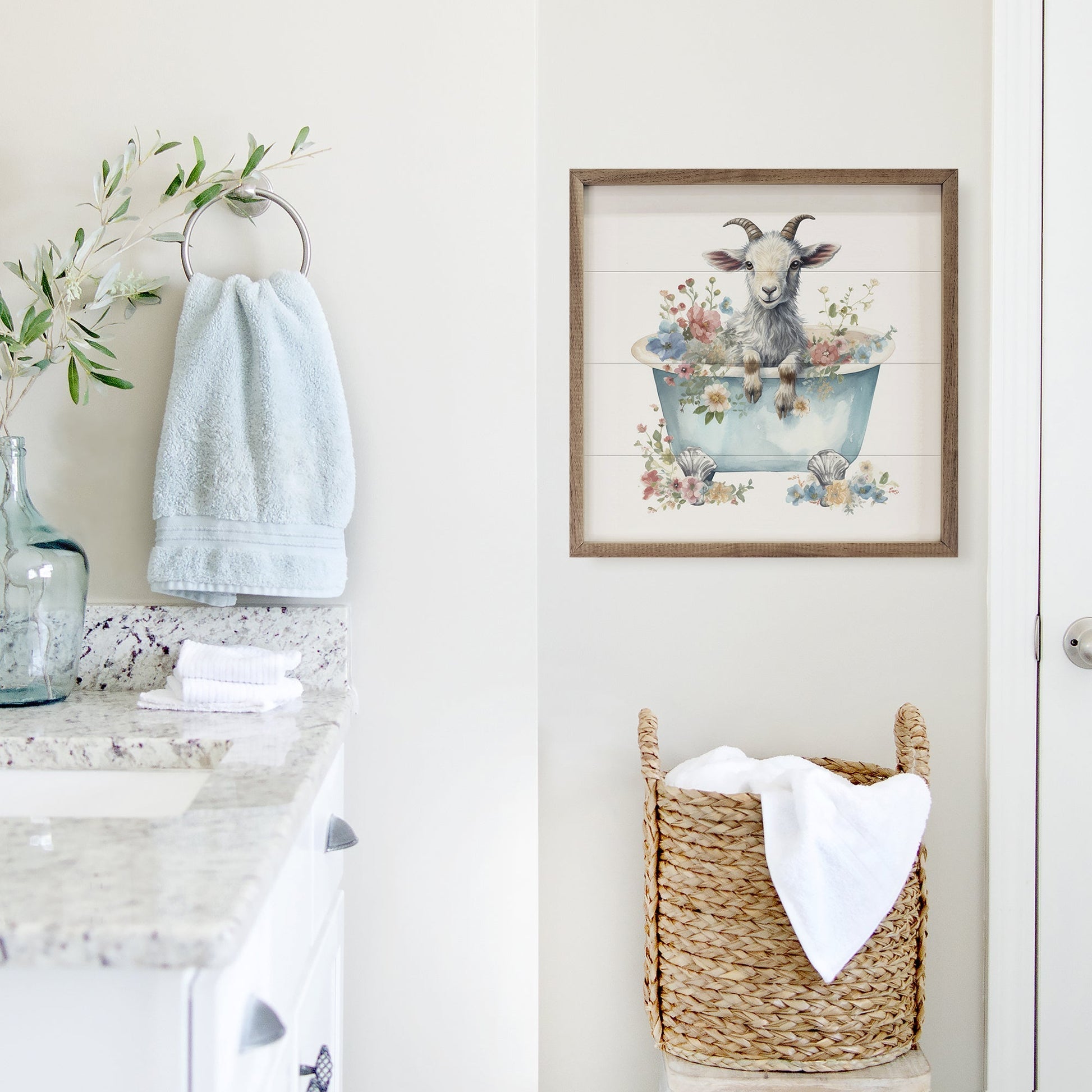 White Goat With Flowers Blue Tub White