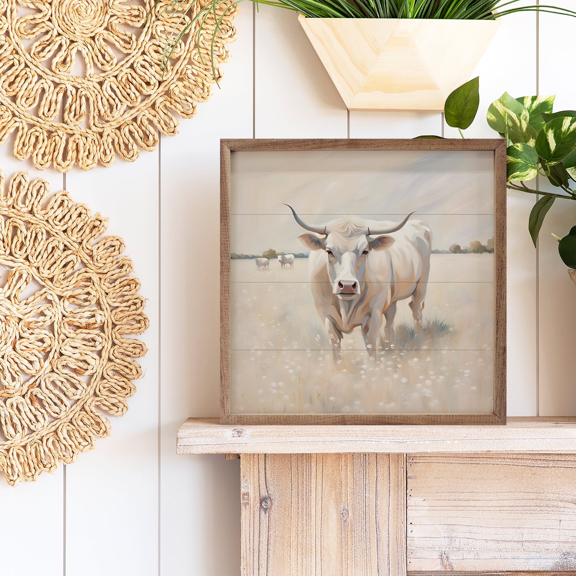 This unique piece is a simple way to bring beauty and charm to any wall or shelf within the home. It is made from high quality American hardwood planks with a hand painted face, and printed with UV cured ink, and is framed in a natural walnut frame. Each piece is unique with its own personality, marks, wood grain, and look. Easy to clean with a dry cloth.